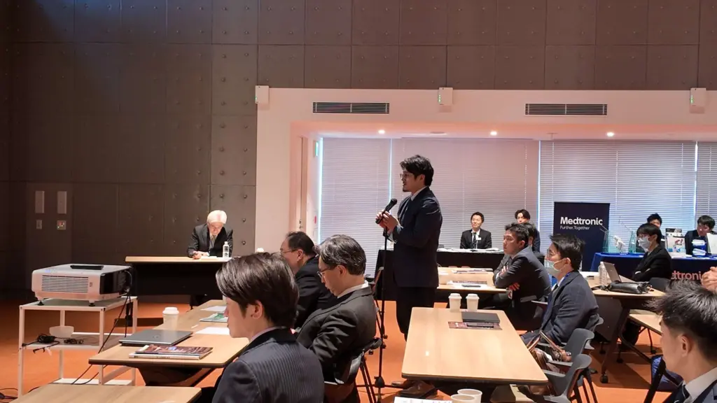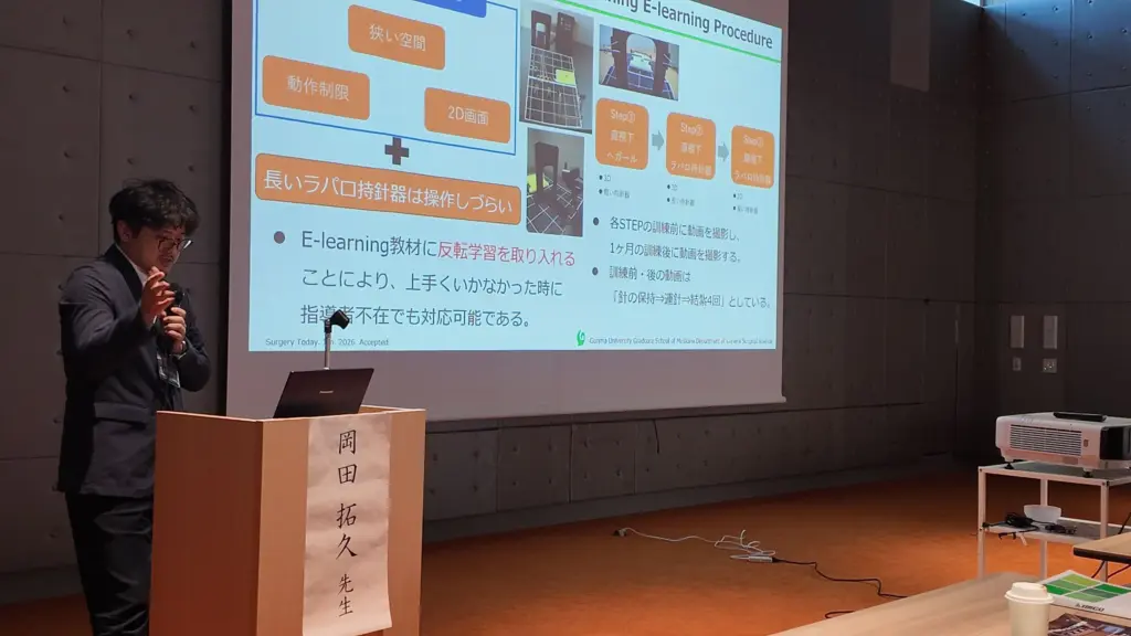 さらに、共催セミナーでは、当科から岡田拓久先生が登壇しました。腹腔鏡下鼠径ヘルニア修復術のデバイス選択・手技の要点・実臨床における工夫、鏡視下縫合結紮の外科教育について講演し、活発な質疑応答がありました。